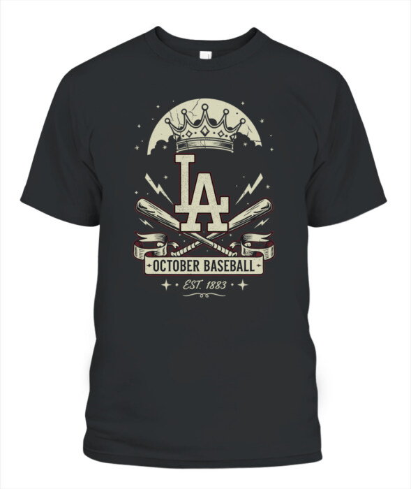 The “October Baseball” Dodgers tee celebrates postseason tradition with a bold crown-and-bats design, honoring LA’s legacy under the lights of October